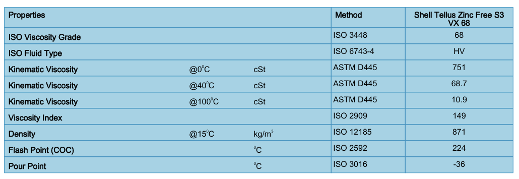 - Khả năng tương thích với gioăng phớt và lớp sơn phủ: Shell Tellus Zinc Free S3 VX 68 tương thích với các vật liệu gioăng phớt và các loại sơn thường được chỉ định sử dụng với dầu khoáng.